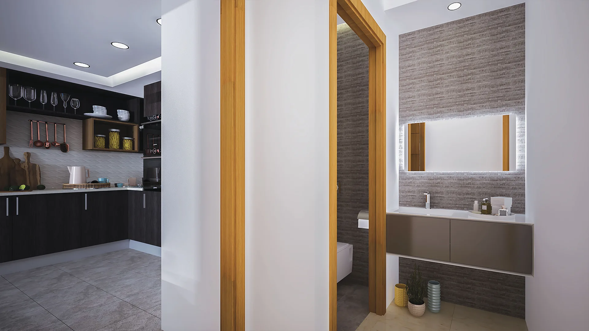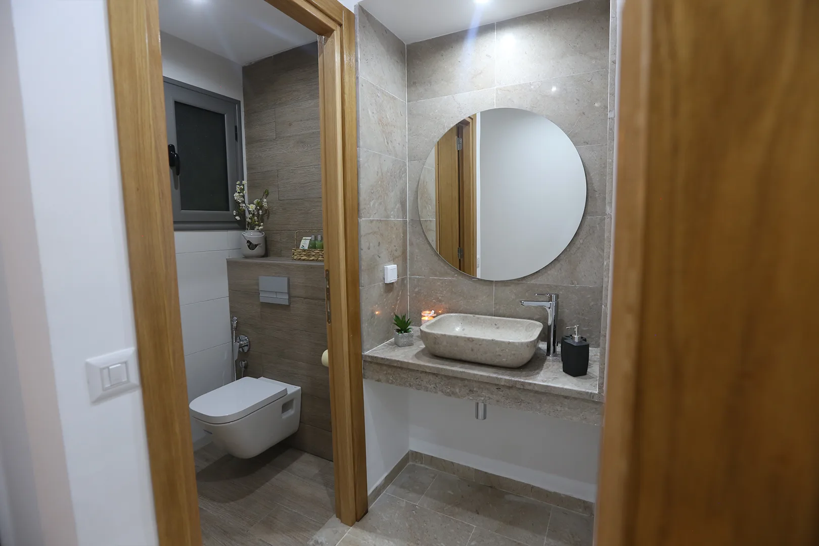 Menuiserie des portes intérieures et habillage des arcs en bois noble.