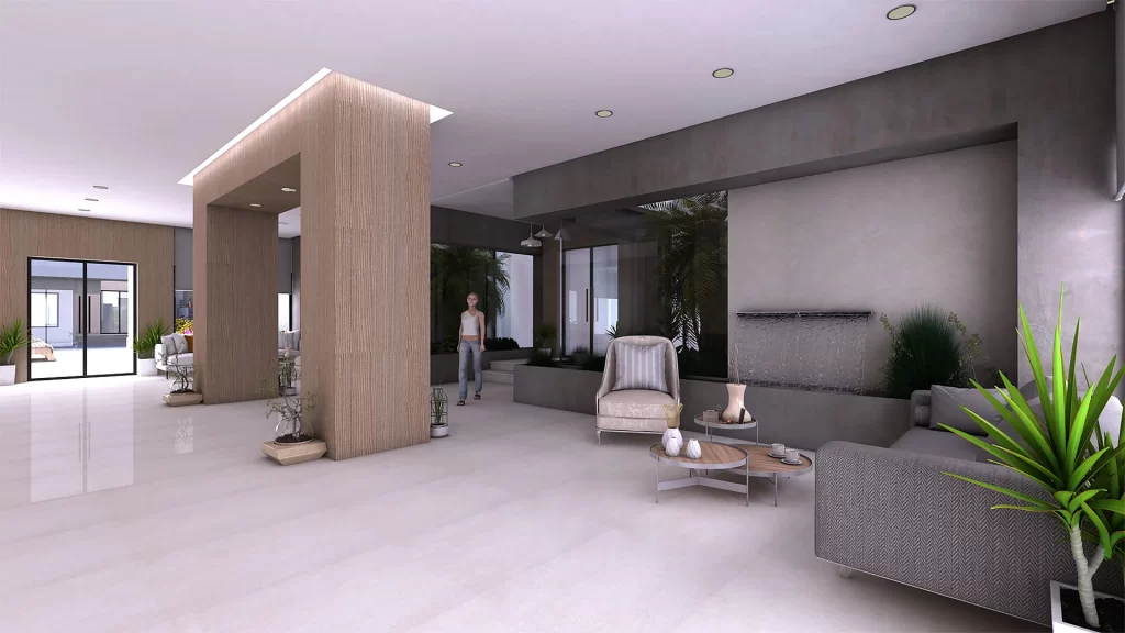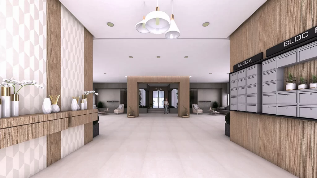 - Aires de stationnement au sous-sol et garages privatifs pour les villas.